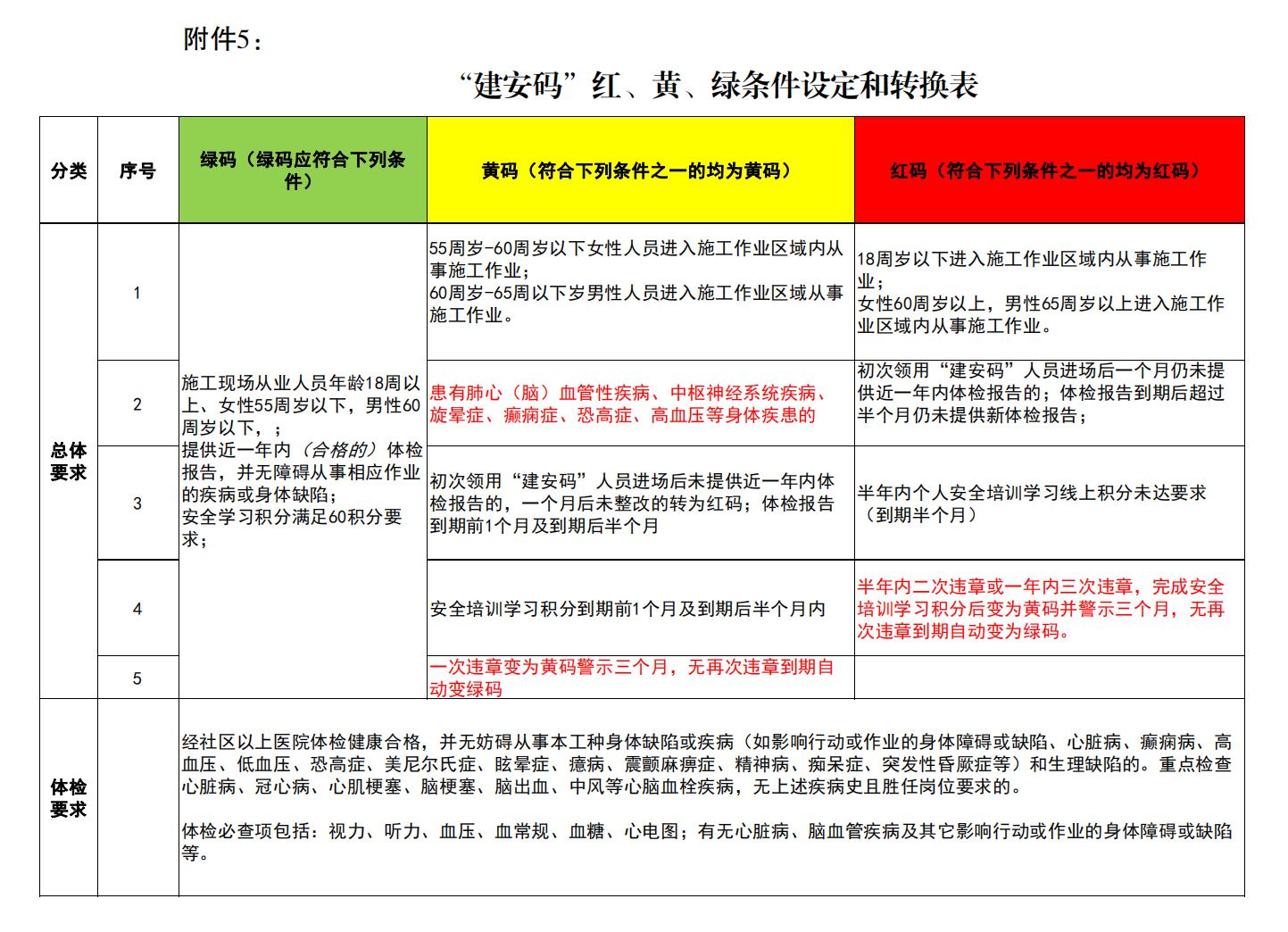 在具体管理方案中,《通知》也做了细化要求:黄码赋予对象,主要是55周岁-60周岁的女性人员和60周岁-65周岁的男性人员,一处工地不能超过10%。红码赋予对象为60周岁以上的女性人员和65周岁以上的男性人员,数量不得超过2个以上。红黄绿三色可通过安全培训学习积分实现动态转换。